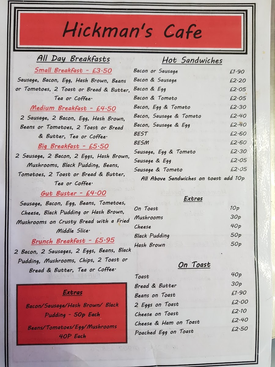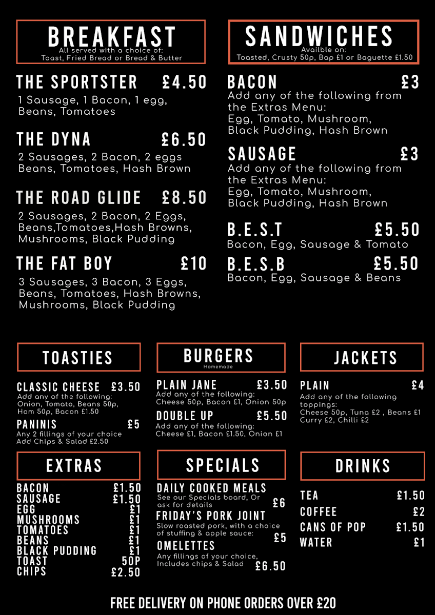 Hot Sandwiches include options such as Bacon & Sausage, Bacon & Tomato, and combinations with sausage, egg, or tomato.
