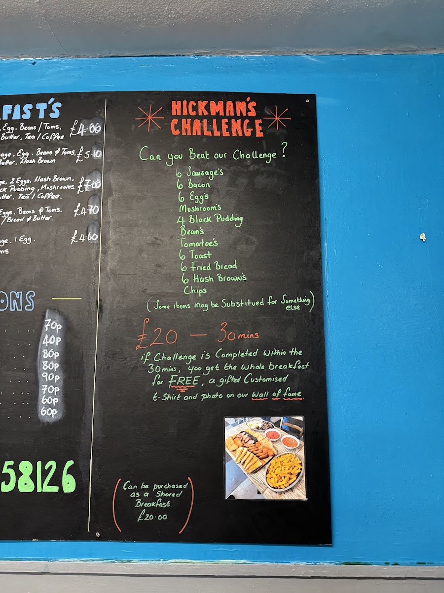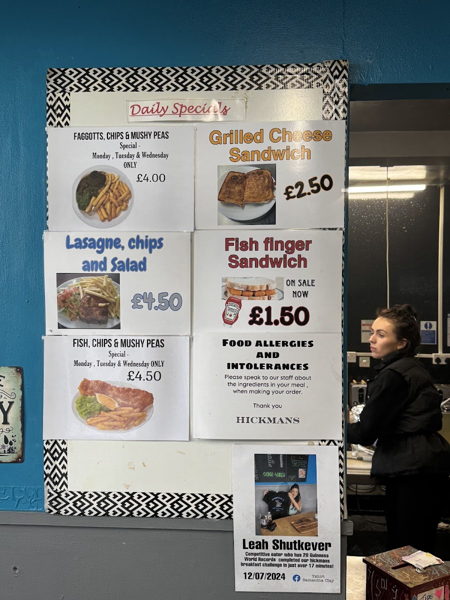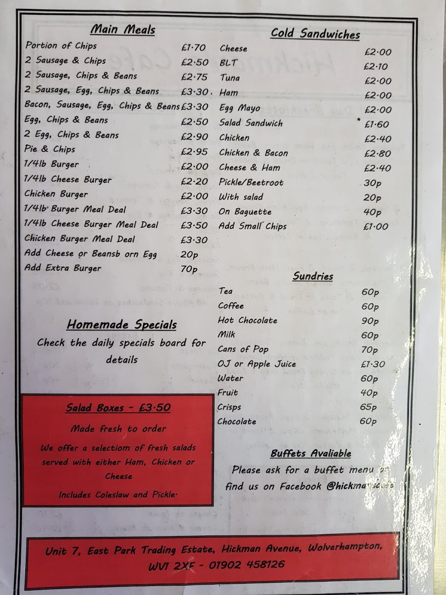 Main Meals provide a wider selection including portions of chips, combinations of sausage, egg and beans with chips, various burgers (including chicken, cheese, and meal deals), pies with chips, and classic breakfast plate options.